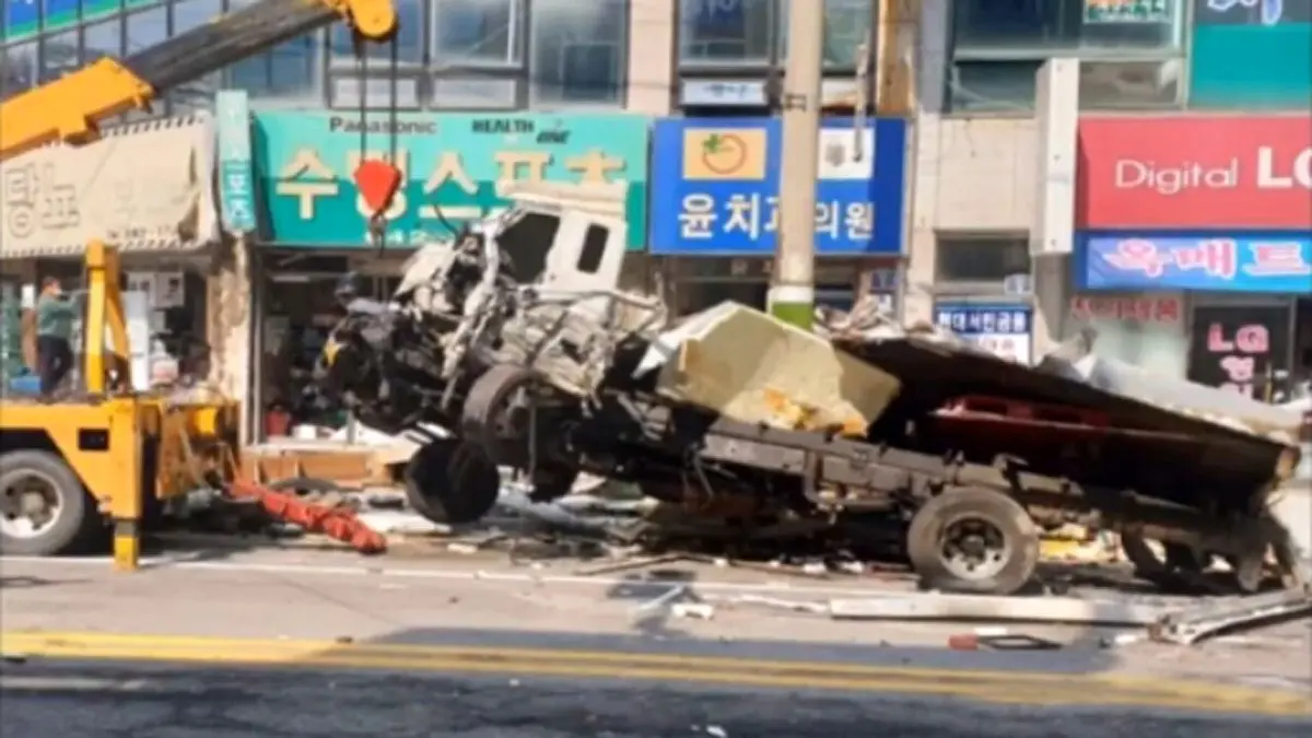 حوادث رکنا: راننده یک کامیون در شهر یوسو در کره جنوبی به دلیل خواب آلودگی با سرعت زیادی وارد چهارراه شد و با یک مغازه تصادف کرد.