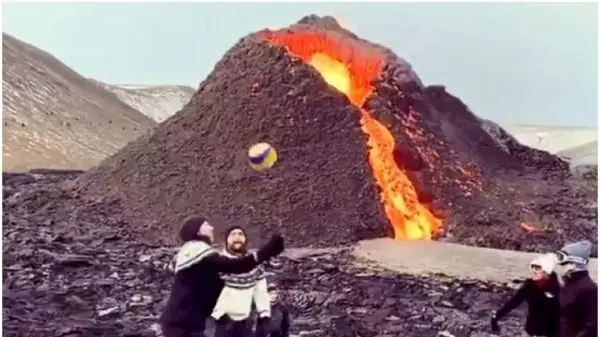 در این ویدئو دست کم ۶ نفر در حالی که در نزدیکی محل آتشفشان در حال انجام بازی والیبال هستند دیده می‌شوند. در این ویدئو در حالی که در پشت سر این جوانان گدازه‌های آتشفشانی به شکلی دیدنی به سمت آسمان پرتاب می‌شوند آن‌ها در آرامش مشغول بازی هستند. این ویدئو در یکی از مناطق آتشفشانی کشور ایسلند تهیه شده است.