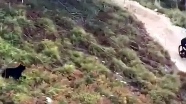 در ویدئو مشاهده میشود که این حیوان با دیدن دوچرخه سوار به سمت پایین کوهستان دویده و دوچرخه سوار را تعقیب میکند. دوچرخه سوار که با دیدن خرس جانش را در خطر میبیند بلافاصله اقدام به فرار میکند.