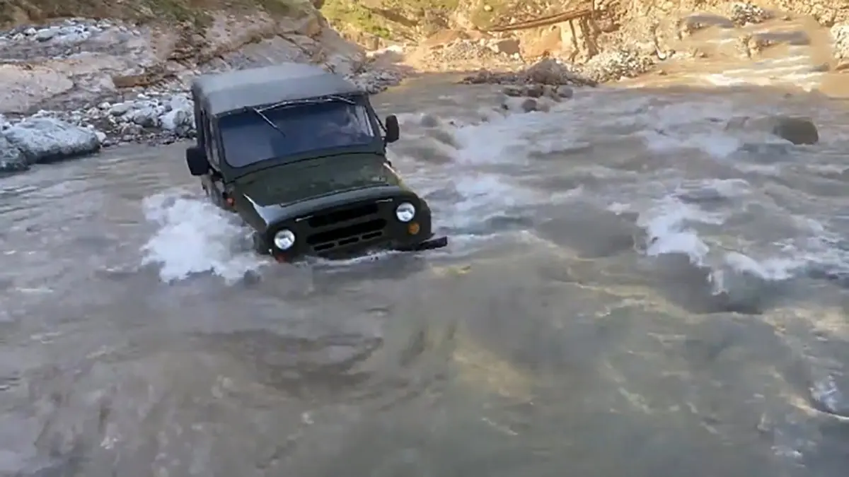 حوادث رکنا:یک خودروی جیپ هنگام عبور از عرض رودخانهای خروشان در ازبکستان متوقف شد.