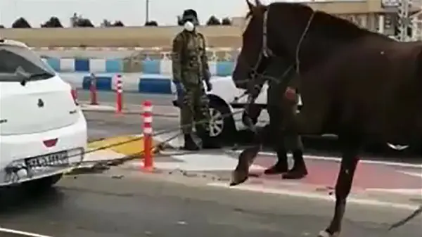 هر چند شاید توجیه این راننده این باشد که با سرعت کم حرکت می کند اما به هر حال روش انتقال اسب به این صورت است که اسب را سوار خودروهای مخصوص انتقال احشام کنند نه اینکه به ماشین ببندند.
