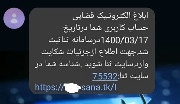 حوادث رکنا : برخی افراد سودجو در پوشش پیامکهای ابلاغ الکترونیک قوه قضاییه به کلاهبرداری می پردازند.