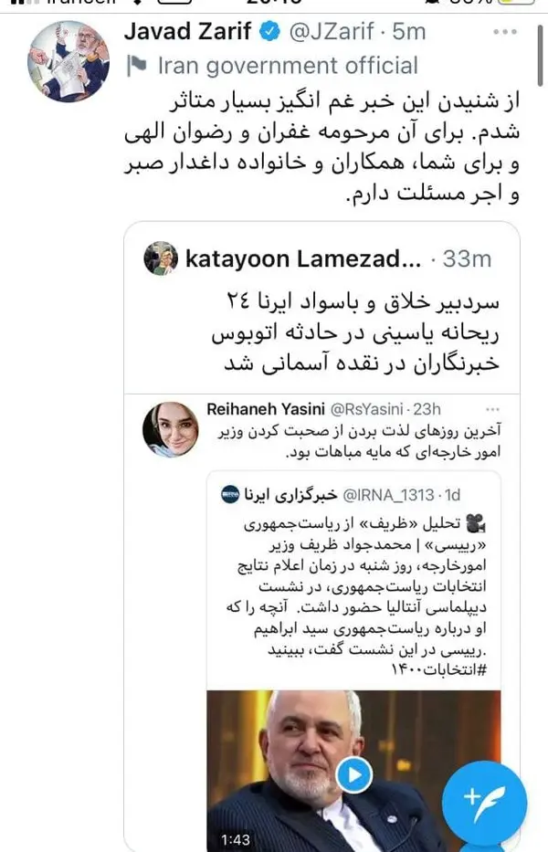رکنا:پیام تسلیت ظریف در پی درگذشت دو خبرنگار ایسنا و ایرنا در حادثه واژگونی اتوبوس حامل خبرنگاران در مسیر دریاچه ارومیه.