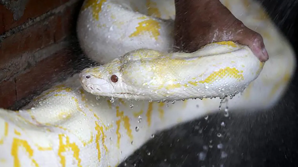 به گزارش رکنا، این خزنده ۱/۶۰ متری ظاهرا از راه فضلاب وارد خانه همسایه می‌شود. قربانی ۶۵ ساله که سحرگاه راهی توالت شده بوده به محض نشستن احساس می‌کند چیزی او را می‌گزد و وقتی درون کاسه توالت را نگاه می‌کند می‌بیند یک مار پیتون سفید در آن جا خوش کرده است.
