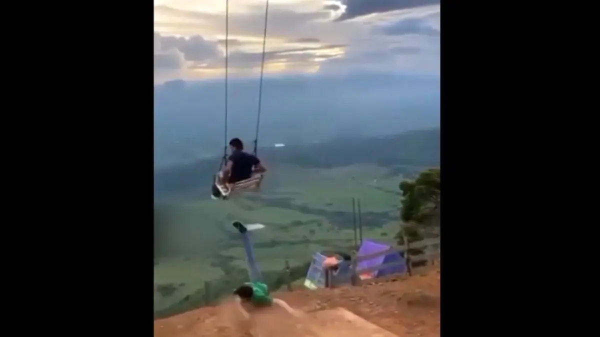 2 مرد در حال تاب بازی بودند که ناگهان اتفاقی برای یکی از این دو مرد رخ داد. تاب بازی تفریح بزرگسالان و کودکان است. در فیلم مشاهده می کنید که یکی از این دو مرد که در حال هل دادن دوستش سوار بر تاب بود ناگهان تعادلش را از دست داد و سر خورد. این مرد نزدیک بود به دره سقوط کند که در لب پرتگاه خدا او را نگه داشت. خود مرد نیز از اینکه عمرش به دنیا بود شوکه شد.