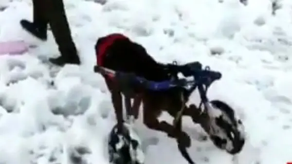 رکنا: سگی که به دلایلی نامعلوم هر دو پایش را از دست داده بود، به لطف یکی از موسسات حامی حیوانات در غرب کشور، با ویلچر مخصوص به گردش میرود.