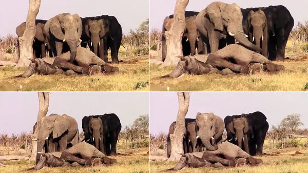 گله ای فیل که در پارک ملی کوبه در بوتسوانا یکی از دوستان خود را از دست دادند حاضر به ترک جسد حیوان مرده نیستند. فیل های برخلاف عظیم الجثه بودنشان قلبی بسیار رئوفی دارند، آنها مانند انسان ها در سوگ دوستشان به عزا نشستند و با خرطوم جسد حیوان مرده را نوازش می کنند. فیل مرده که بر اثر شکستگی پایش دچار مشکل شده بود، توسط پرسنل پارک برای رهایی از درد کشته شد. در این فیلم  نشان داده می شود  جسد فیل توسط یکی از فیل ها چگونه نوازش می شود و فیل های دیگر نیز نزدیک جسد ایستاده اند. کفتارها و شغال ها بعلاوه شیرهای گرسنه که بوی لاشه به مشامشان رسیده اطراف جسد می چرخیدند. محققان بر این باورند فیل ها مانند انسان ها ضمن سوگواری در مرگ عزیزانشان ناراحت می شوند.برای ورود به کانال تلگرام ما کلیک کنید.
