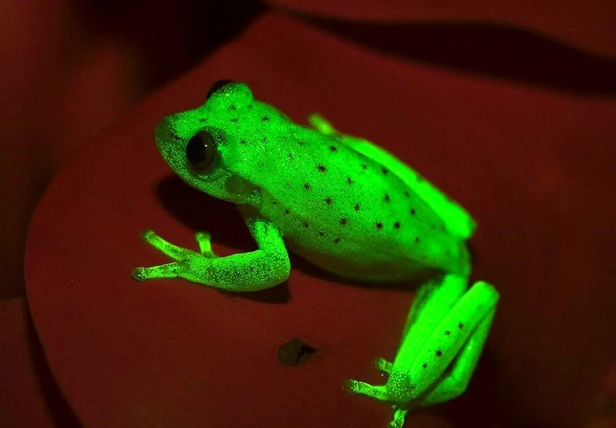 این قورباغه که در نگاه اول یک قورباغه معمولی به نظر میرسد در برابر تابیده شدن نور ماوراءبنفش به رنگ سبز فسفری تغییر رنگ داد.