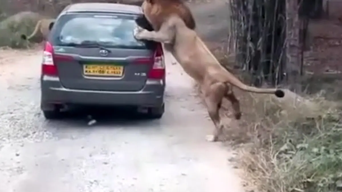در این ویدئو، در ابتدا شیر اول به خودروی جهانگردان نزدیک می شود و سپس راه خود را کج می کند، اما شیر دوم که جدی بود سعی کرد تا وارد خودرو جهانگردان شود. در این حادثه، هیچ یک از مسافران آسیب ندیدند.