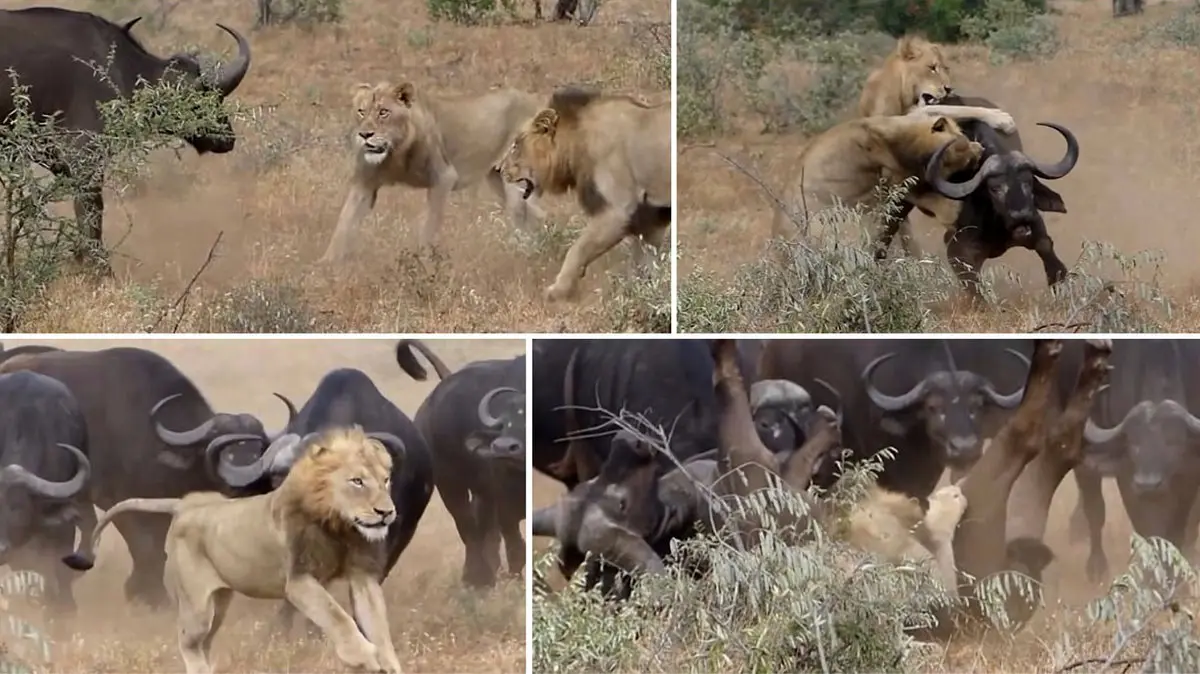به گفته یک کارشناس به ندرت چنین مواردی در حیات وحش دیده می شود. هجوم گله بوفالوها به دو شیر باعث ترس سلطان های جنگل شده و شیرها را مجبور به فرار Escape می کند.برای ورود به کانال تلگرام ما کلیک کنید.