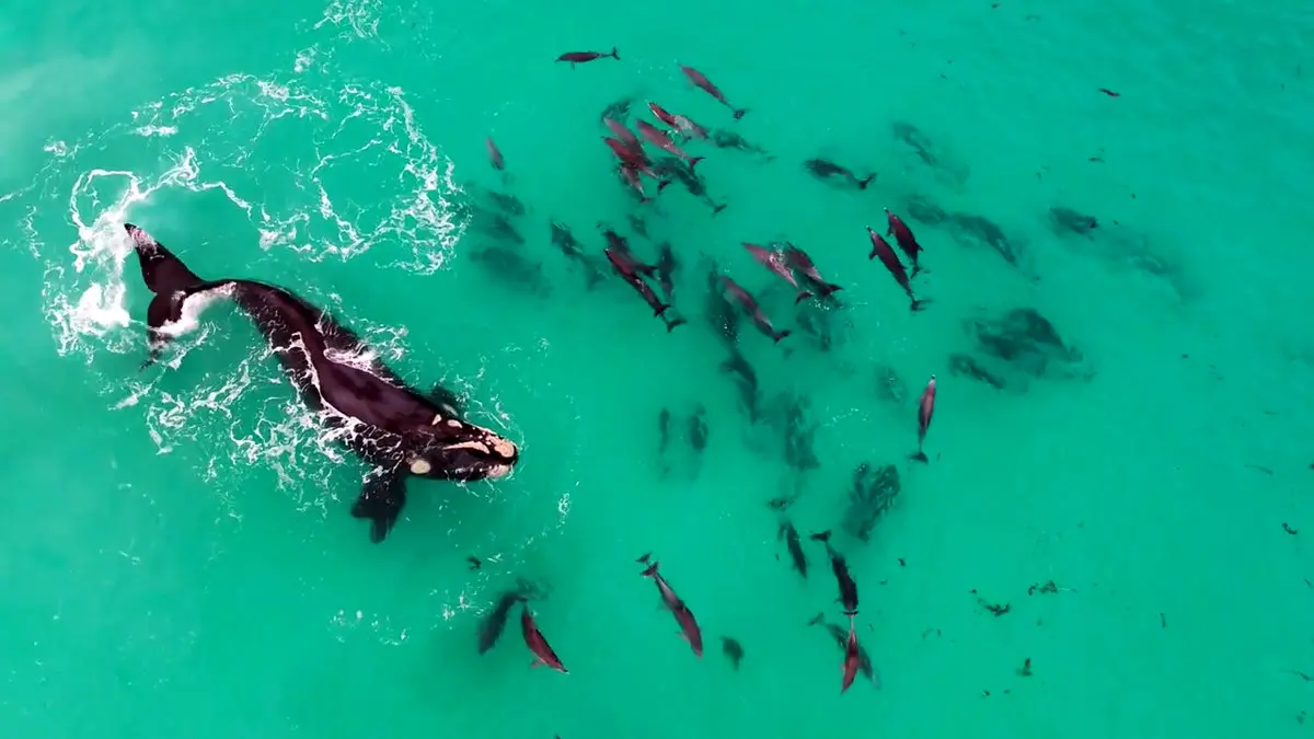 این فیلم که توسط یک هواپیمای بدون سرنشین گرفته شده است صحنه نادری از بازی کردن یک نهنگ بالغ را با یک گروه از دلفینها به تصویر کشیده است.