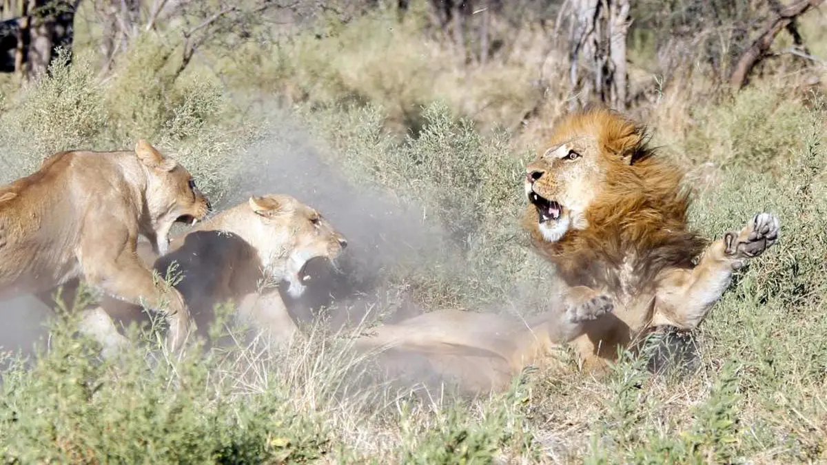 شیر نر سعی می کند در مقابل هجوم شیرهای ماده مقاومت کند.
