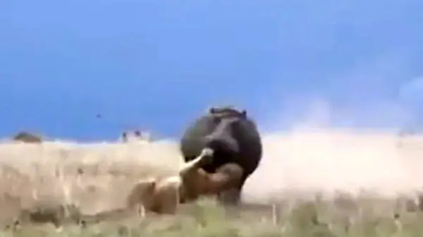 اسب آبی غول پیکر با شیر در گیر شده و در نهایت شیر مهاجم را فراری می دهد.