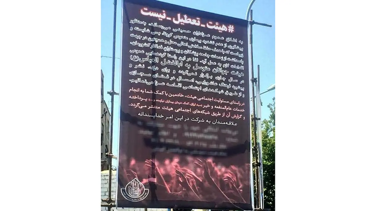 یکی از این هیاتها؛ هیات معروف" متوسلین به ابالفضل العباس(ع) " واقع در شرق تهران است که هرساله در ایام عزاداری امام حسین(ع) مملو از جمعیت و برپایی مراسم عزاداری بوده است. اما امسال حدود بیست روز مانده تا ماه محرم به خاطر شرایط خاصی که به دلیل ویروس کرونا در کشور وجود دارد با نصب بنر و با « هیات- تعطیل- نیست به شرکت کنندگانی که هر ساله در مراسم عزاداری حضور داشتند اعلام کرده است که به منظور پیشگیری از عدم تشدید بیماری منحوس کرونا، بسی شایسته است و زیباست که با هدف حفظ سلامتی اهالی محله و همچنین در جهت پاسداشت زحمات جامعه پزشکان و پرستاران فداکار کشورمان، اقدامات لازم به عمل آید، لذا در این راستا گردهمایی عمومی هئیت جوانان متوسل به ابالفضل العباس(ع) در سال جاری برگزار نمیگردد و برای درک، نشر و پیشبرد فرهنگ عاشورایی، امسال در فضای مجازی و از طریق شبکههای اجتماعی اقامه عزا مینمائیم.»