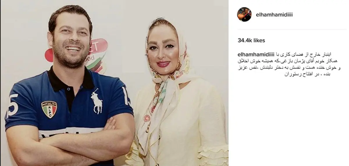 رکنا: الهام حمیدی بازیگر زن معروف سینما و تلویزیون عکسی را در کنر پژمان بازغی در افتتاحیه یک رستوران منتشر کرد.