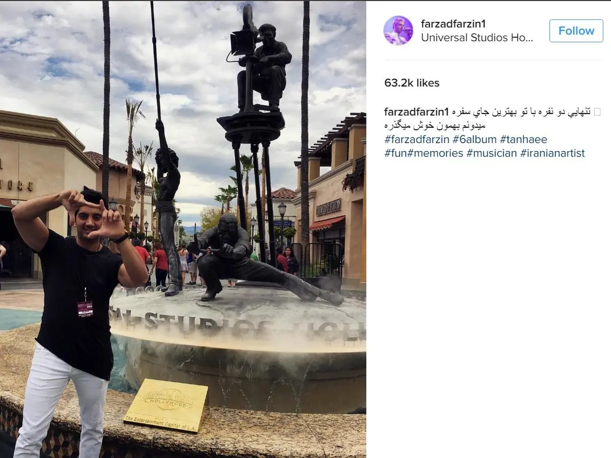 فرزاد فرزین بعد از اجرای تور کنسرتهای خود در تهران به مدت 3 ماه برای استراحت به آمریکا سفر کرده است. او روز گذشته با انتشار تصویری از خود در استودیو فیلمسازی و پارک موضوعی "یونیورسال استودیوز هالیوود" در لس آنجلس، نوشت: