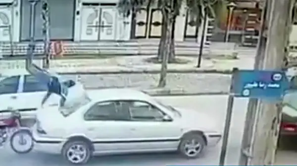 رکنا: موتور سواری که با خودرو سمند تصادف کرده بود به طرز معجزه آسایی روی سقف خودرو نشسته و آسیب نمی بیند.