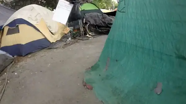 این شهر پارکی در کانادا است که معتادان در آن چادر زده و زندگی می کنند ، همانطور که درفیلم می بینید دو چرخه هایی جلوی این چادر ها پارک شده که دزدی هستند.