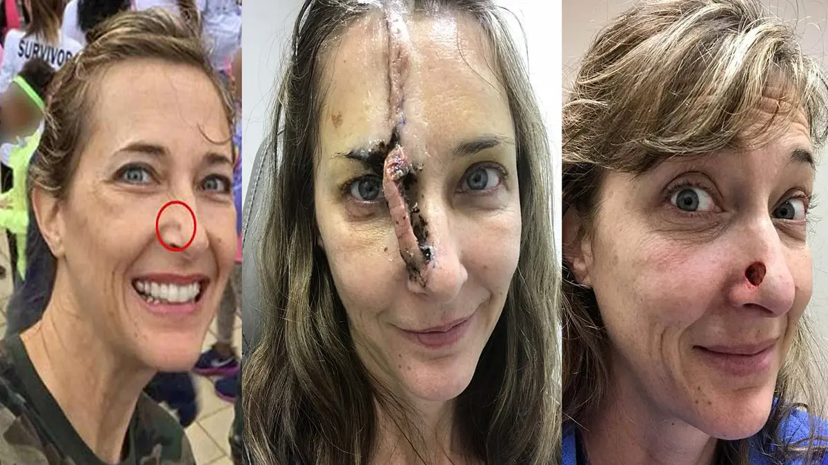 رکنا: این زن که عشق برنزه شدن داشت و از سوختن در آفتاب لذت میبرد سرطان پوست بدی گرفت تا جایی که پزشکان مجبور شدند تکهای از بینیاش را بکنند.