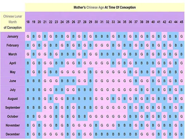 در طب چینی از جدول زیر هم برای تشخیص جنسیت جنین استفاده می شود. در این جدول بر اساس ماه بارداری مادر و سن مادر در هنگام بارداری نوع نوزاد تشخیص داده می شود. سن و ماه بارداری در این جدول بایستی بر اساس ماه های قمری چینی باشد.