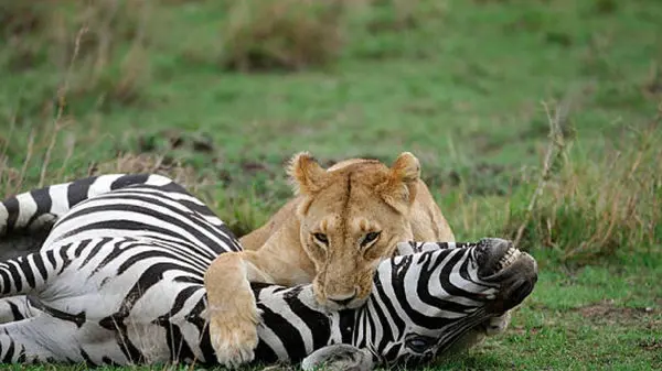 بله همان طور که حدس می زدم دو شیر درنده از پشت بوته ها و در کنار درخت بیرون آمدند و به دقت گورخر را زیر نظر گرفته بودند از طرف دیگر تعدادی ماده شیر نیز نظاره گر گورخر بی چاره بودند اما فاصله آن ها با او بسیار زیاد بود با این حال ناگهان یکی از ماده شیر ها تصمیم گرفت تا به سمت گورخر برود و او را از پا در بیاورد پس به آرامی در حال تعقیب او بود و بعد ناگهان دیدیم که ماده شیر گرسنه درست بر بالای سر شکار خود قرار گرفته است و ظرف چند دقیقه گرد و غبار شدیدی به پا کرد و بعد هم او را از پا در آورد. بعد از چند دقیقه باقی شیر ها نیز به او پیوستند. البته که درگیری ای نیز بین شیر ها به وجود آورد.