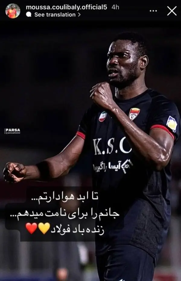 این مدافع باتجربه که سالهای زیادی است در فوتبال ایران حضور دارد، با انتشار یک استوری در فضای مجازی نشان داد که دوست دارد به کار خود در فولاد ادامه بدهد. کولیبالی تصویری از خودش را در اینستاگرام منتشر کرده و با قلبهای قرمز و زرد به عنوان نماد رنگهای فولاد نوشته است: «تا ابد هوادارتم... جانم را برای نامت میدهم. زنده باد فولاد.»