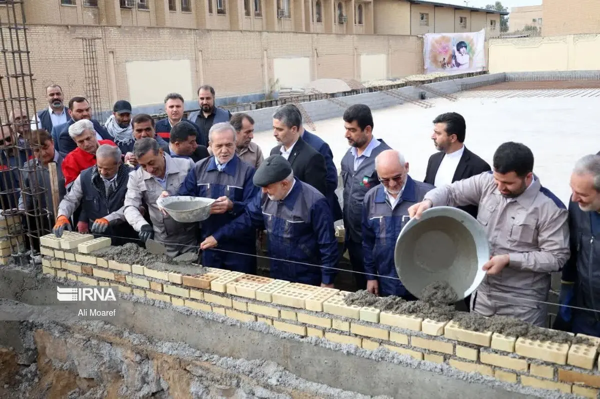 فیلم/ابتکار جالب رئیس جمهور در خوزستان/ پزشکیان شخصا خشت اول را نهاد!