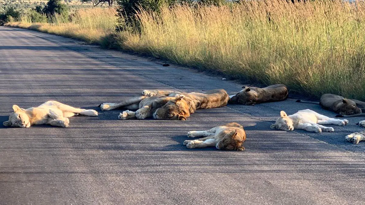 رکنا: در رویدادی بی سابقه گروهی از شیرها در وسط جاده ای در پارک ملی کروگر آفریقای جنوبی خوابیدند.