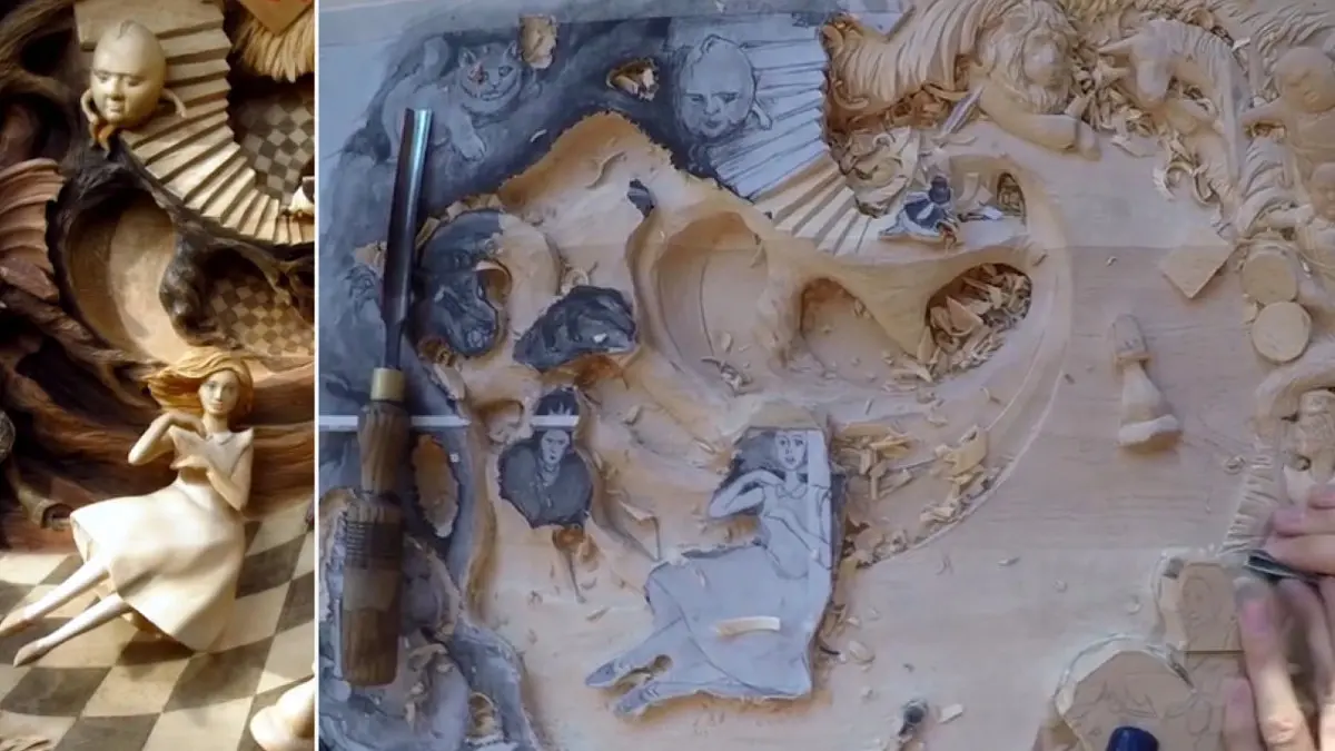 رکنا: یک هنرمند خلاق تصاویری را با الهام از داستان معروف آلیس در سرزمین عجایب روی چوب حکاکی کرد.