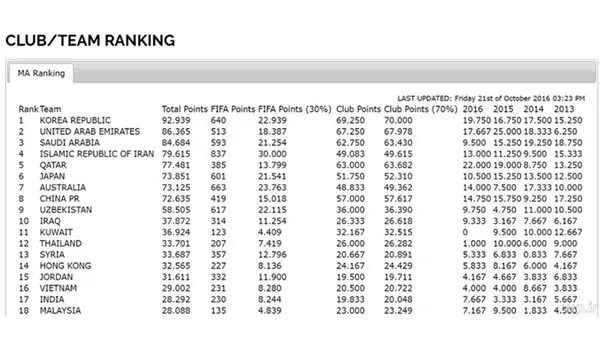 به نقل از سایت رسمی کنفدراسیون فوتبال آسیا، کشور کره جنوبی به علت درخشش نمایندگان باشگاهی اش در لیگ باشگاه های آسیا در صدر جدول رنکینگ باشگاه های آسیا قرار دارد. این رنکینگ با توجه به عملکرد تیم ها در 4 سال اخیر اعلام می شود که 70 درصد آن با توجه به نتایج باشگاه ها و 30 درصد نتایج تیم های ملی است.