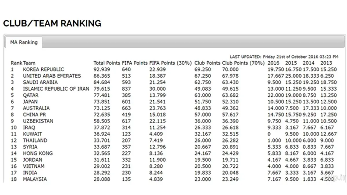 نکته قابل توجه این است که با توجه به بازی های خوب تیم العین امارات در باشگاه های آسیا، کشور امارات در رتبه دوم این رنکینگ قرار گرفته است. تیم سوم رنکینگ باشگاه های آسیا، کشور عربستان است.