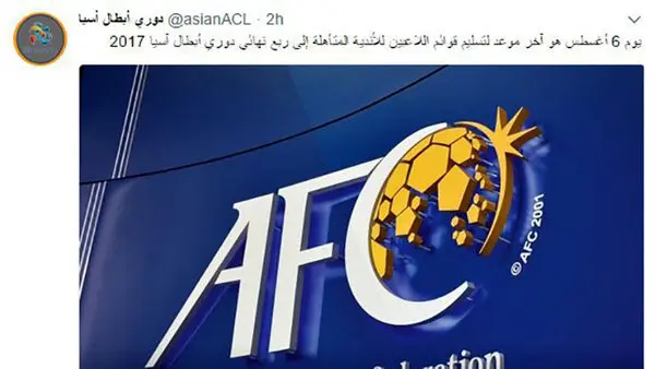 حساب توییتر لیگ قهرمانان آسیا از ضرب الاجل کنفدراسیون فوتبال این قاره به تیم های حاضر در مرحله یک چهارم نهایی لیگ قهرمانان آسیا برای ارسال لیست اسامی بازیکنانشان خبر داد.
