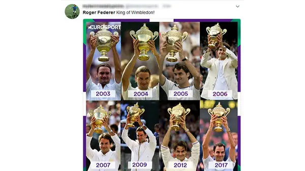 قهرمانی راجر فدرر در رقابتهای ویمبلدون 2017، موجب شد تا کاربران هزاران پست درباره تنیسور سوئیسی منتشر و نام "راجر فدرر" به داغترین موضوع شبکه های اجتماعی تبدیل کنند. بسیاری از چهرههای ورزشی نیز با انتشار پستهایی قهرمانی فدرر را تبریک گفتند.