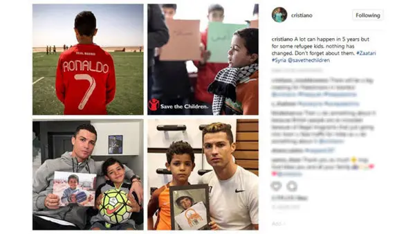 کریستیانو رونالدو، ستاره پرتغالی تیم رئال مادرید، با انتشار تصاویری همراه پسرش در اینستاگرام Instagram از کودکان پناهنده حمایت کرده و از همه مردم خواست تا آنها را فراموش نکنند.