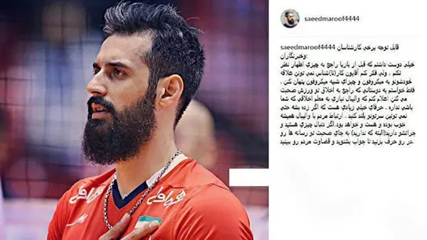 سعید معروف، کاپیتان تیم ملی والیبال با انتشار پستی در اینستاگرام Instagram ضمن بیان اظهارات تندی علیه برخی کارشناسان و خبرنگاران ،عنوان کرده است: "والیبال به معلم اخلاقی همانند آنها نیاز ندارد."