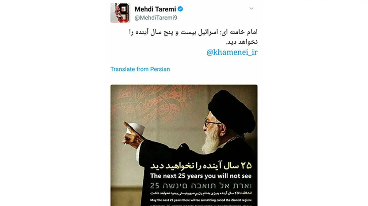 مهدی طارمی در صفحه توئیترش نوتش: "امام خامنه ای: اسرائیل بیست و پنج سال آینده را نخواهد دید".برای ورود به کانال تلگرام ما کلیک کنید.