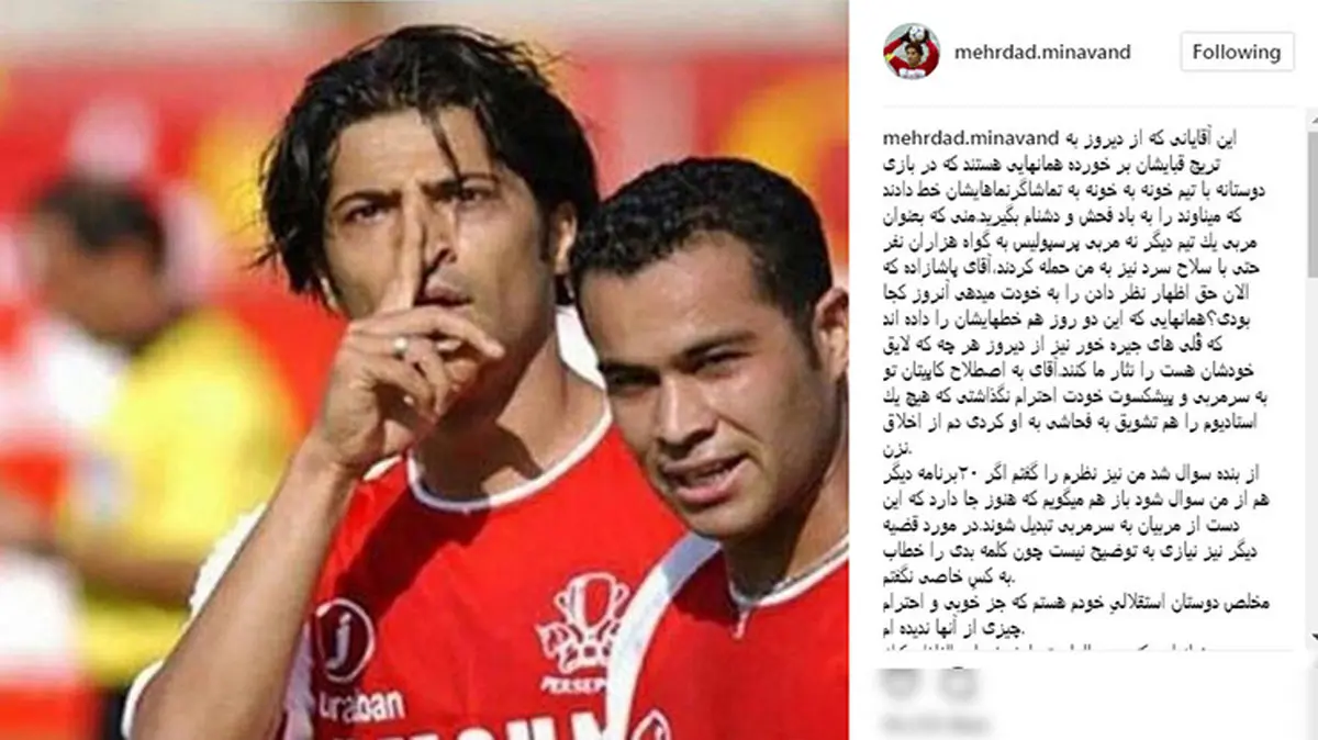 مهرداد میناوند پیشکسوت تیم پرسپولیس روز گذشته (شنبه) در یک برنامه تلویزیونی حرف هایی را در خصوص علیرضا منصوریان (سرمربی استقلال) و مهدی رحمتی (دروازه بان استقلال) زد که این صحبت ها با واکنش های زیادی نیز همراه شد تا جایی که اخباری مبنی بر آمادگی استقلال Esteghlal و رحمتی برای شکایت از این بازیکن سابق پرسپولیس نیز به گوش رسید.