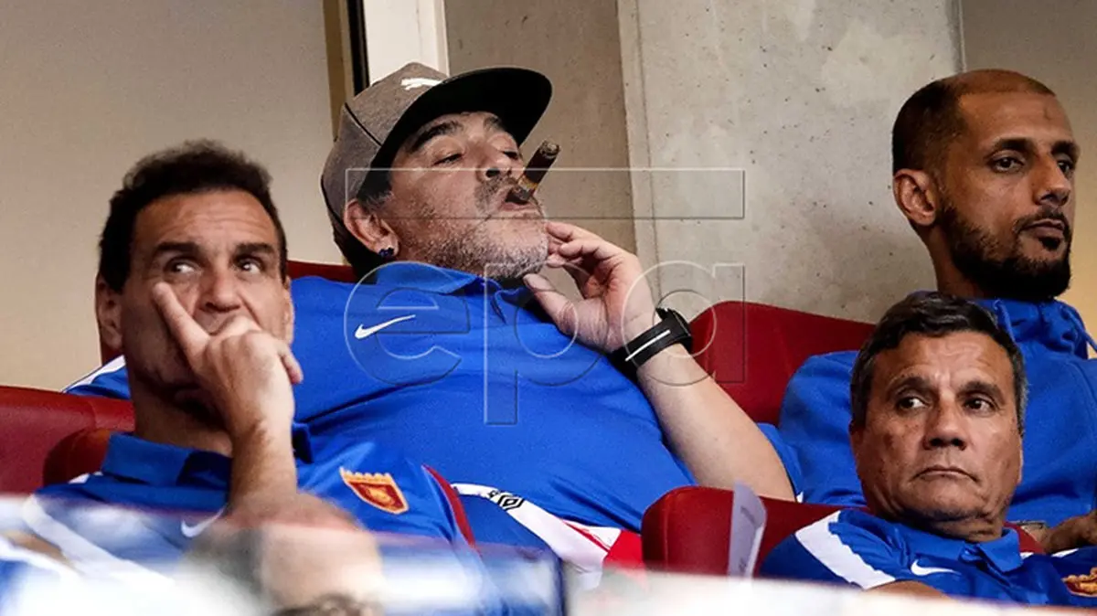دیگو آرماندو مارادونا اسطوره آرژانتینی فوتبال جهان شب گذشته درحالی که سیگار بر لب داشت، دیدار دو تیم آلکمار و آیندهوون را تماشا می کرد.