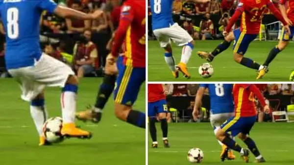 ایسکو در محاصره سه بازیکن ایتالیا با مهارت توانست توپ را حفظ کرده و سپس به «مارکو وراتی»، ستاره موردنظر بارسلونا در نقل و انتقالات تابستانی به سبک بازیکنان فوتسال لایی بزند.