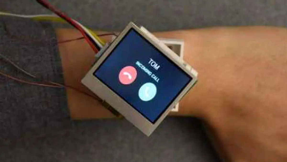 نمونه اولیه این صفحه ساعت هوشمند که توسط محققان کالج دارتموت آمریکا و دانشگاه واترلو کانادا ابداع شده است می تواند بچرخد، به صورت لولایی خم شود، برگردد ، بلند شود و در بند ساعت دور بزند.