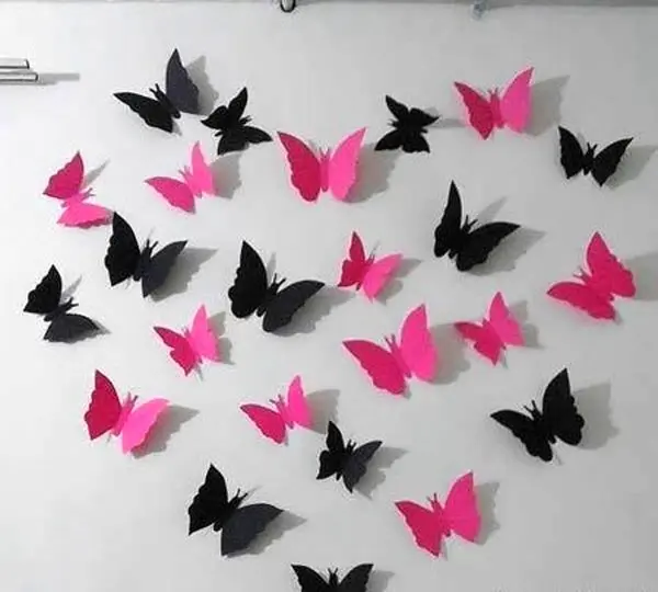 تزیین دیوار با پروانه های کاغذی و رنگی از انواع روش های تزیین برای دیوار اتاق خواب و دیوار بخش های مختلف منزل است شما می توانید پروانه ها با انواع سایز های کوچک و بزرگ را روی کاغذ رنگی بکشید و طرح متفاوتی را روی دیوار منزل خود ایجاد کنید همچنین می توانید برای تزیین کردن دیوار با پروانه های کاغذی از چند رنگ مختلف کاغذ تا استفاده کنید تا پروانه های کاغذی با رنگ های مختلفی را داشته باشید.