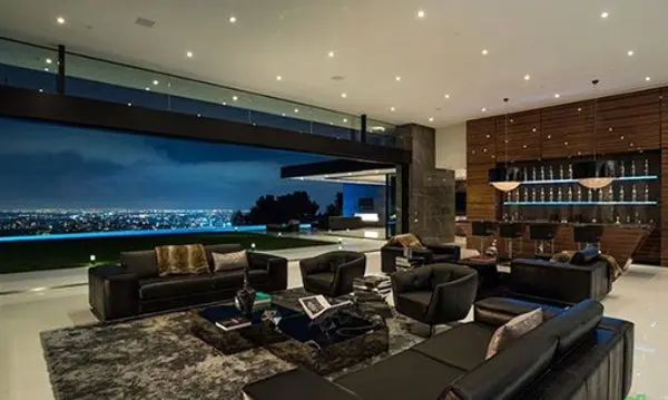 در شکل زیر یک نمای بسیار زیبا از این خانه لوکس را مشاهده می کنید. نشستن بروی کاناپه های مشکی رنگ بهمراه یک نوشیندنی خوشمزه در کنار این نمای شگفت انگیز و زیبا از شهر، مسلما برای هر شخصی لذت بخش خواهد بود. شاید اندکی حسرت انگیز باشد که مالکین این خانه چنین کاری را هر روز بارها و بارها انجام می دهند و از دیدن نمای شهر خسته نمی شوند. در طول شب اما زیبایی منظره دو چندان می شود چرا که تلالو نورهای چشمک زن و در حال حرکت چراغ ها، آن هم از فاصله ای دور، مانند یک اثر هنری متحرک بنظر می آید.