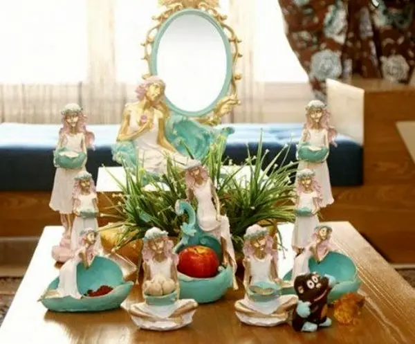 در مرحله بعد، برای لباس مجسمهها از رنگ سفید و مابقی قسمتها از رنگ آبی فیروزهای و صورتی استفاده کنید. برای زیباتر شدن این مجسمهها و اینکه جلوه بیشتری داشته باشند از ورق طلای مایع استفاده شود.