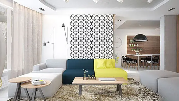 اولین خانه ای که بررسی خواهیم کرد یک آپارتمان تک خوابه بسیار کوچک است اما در عین حال به هیچ وجه شیکی خانه فدای کوچکی آن نشده است. زمینه اتاق نشیمن سفید زده شده تا رنگ های شادی مانند زرد و سبز تیره مبلمان  راحتی، خود را بخوبی نشان بدهند. از دید دیگر در اتاق نشیمن، از  قفسه های زرد رنگ رنگ کنار قفسه های چوبی به رنگ روشن استفاده شده است. در تمامی این قسمت ها زمینه کف و دیوارها سفید است تا رنگ های شادی که هر چند خیلی کم و جزئی هستند اما به خوبی خود را نشان دهند.