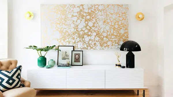 به خوبی می توانید ببینید که مجسمه هنری طلایی که بر روی آن قرار دارد تناسب بسیار خوبی با سایر وسایل روی میز و یا حتی نقوش روی دیوار بالایی و حتی چراغ ها دارد. از طرف دیگر رنگ مشکی آن با قاب عکس هماهنگ شده. در کنار تمامی اینها رنگ سبز گلدان ها نبز با یکدیگر هماهنگ گشته اند. این تنها سه نمونه از ترکیب زیبا و مناسبی است که می تواند مانند یک جادو عمل کرده و دکوراسیون شما را بی نظیر گرداند.