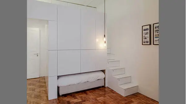 رکنا: در این آپارتمان کوچک و مدرن کمدهای دیواری سفید رنگی در تطابق با رنگ دیوار تعبیه شده است که علاوه بر کمدهای موجود برای ذخیره سازی وسایل، در قسمت زیرین، تخت خوابی را در خود پنهان کرده که در مواقع نیاز از آن استفاده میشود.