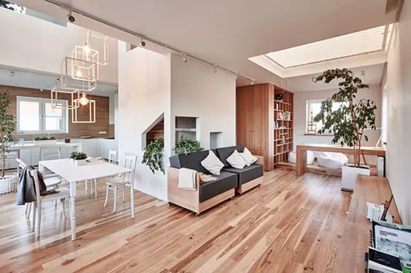 رکنا:این خانه ی دوبلکس مخصوص یک خانواده جوان در مسکو طراحی شده که شاخصه ی اصلی طراحی استفاده از رنگ سفید و متریال چوب و همچنین بهینه سازی فضا بدون دیوار جدا کننده در فضا بوده است.
