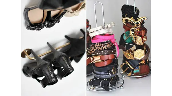 یکی از نکات مثبت راجع به کفشهای پاشنه بلند این است که میتوان آنها را با یک ترفند ساده به زیبایی در کمد جا داد. میتوانید چند میله باریک به در کمد متصل کنید و کفشها را به آن بیاویزید.