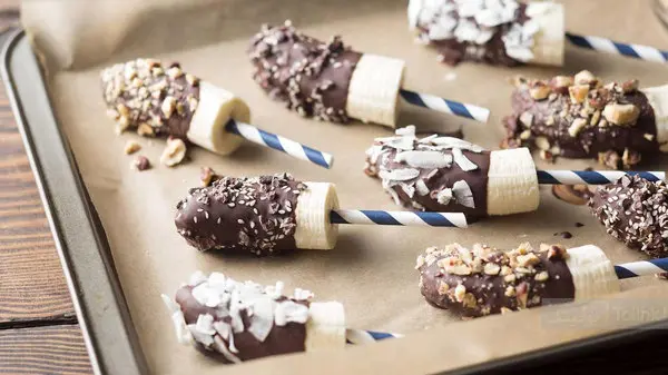 1- موزها را پوست بکنید و هر کدام را از وسط نصف کنید. نی یا چوب بستنیها را در انتهای موز فرو کنید.