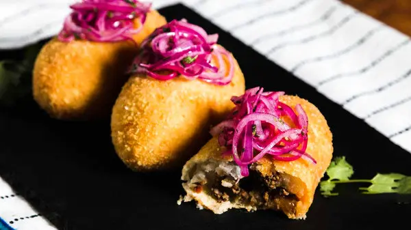 7- مقداری از مایه گوشت روی سیب زمینی قرار دهید و سیب زمینی را از اطراف جمع کنید و به شکل بیضی در بیاورید، در آرد سوخاری بغلتانید، داخل روغن بیندازید و سرخ کنید.